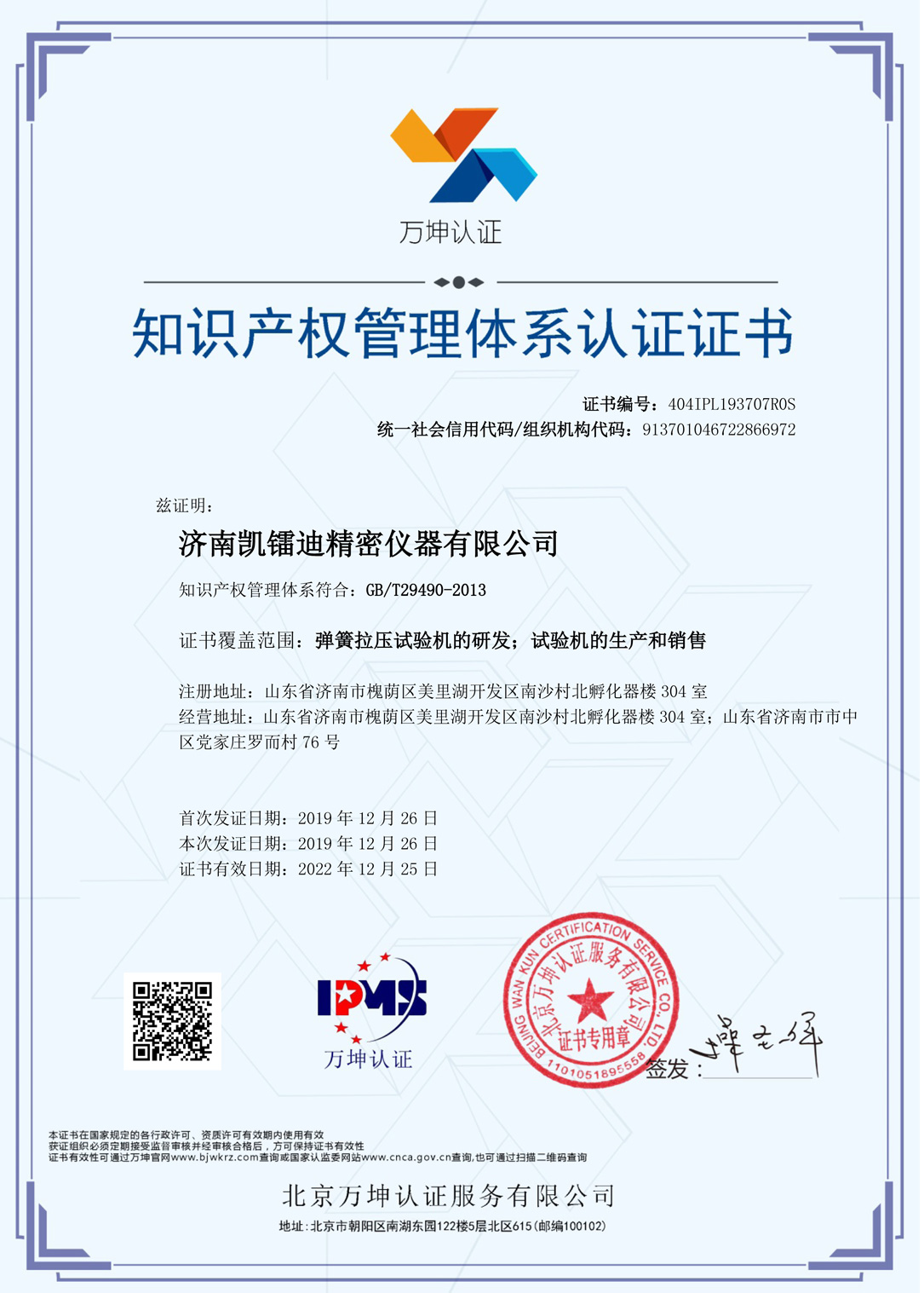 知識産權管理體系認證證書 - 濟南凱鐳迪彈簧有限👽公司